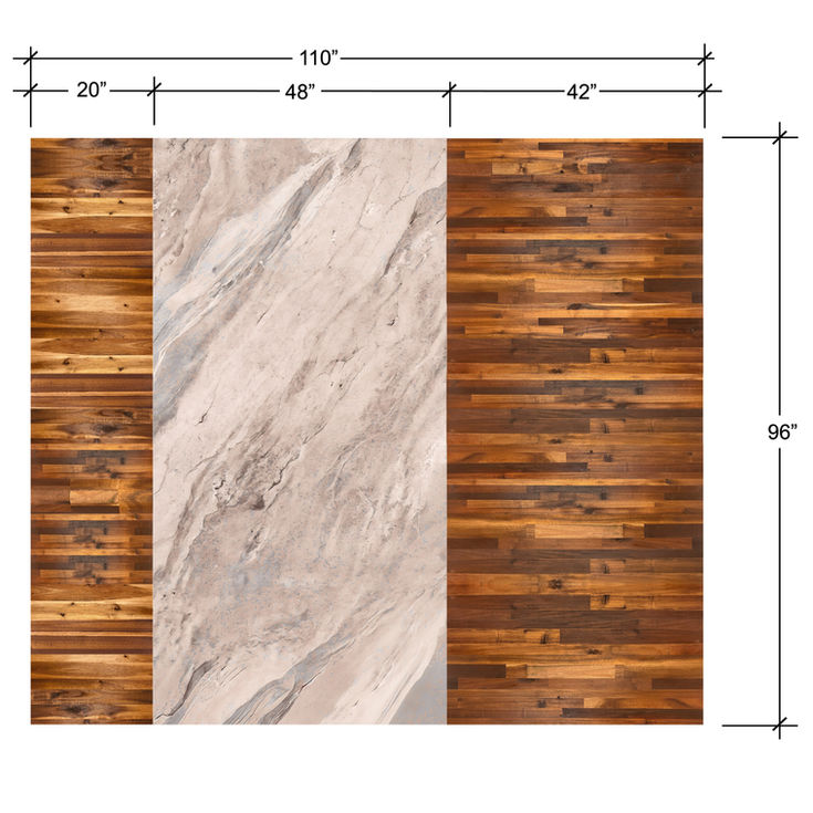 Beige marble panels are set between richly grained wood cladding. The design emphasizes the vertical contrast and adds a gentle radiance. It’s a design that feels grounded yet bright.