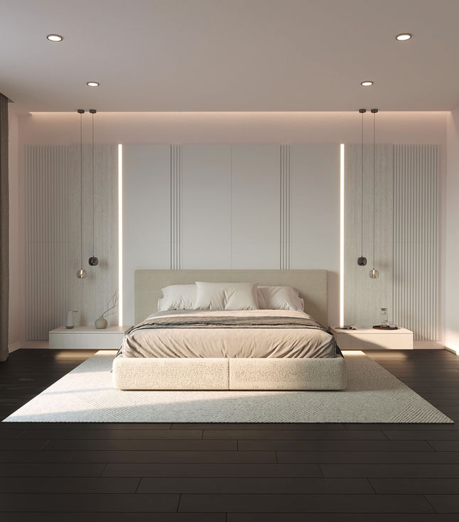 Monolithic Cashmere panels with fine vertical scores and side light channels deliver a minimalist, couture look. Subtle grooves create shadow lines that change through the day, keeping the wall lively yet calm. The neutral palette pairs with any bedding and décor, future-proofing your style with timeless simplicity.